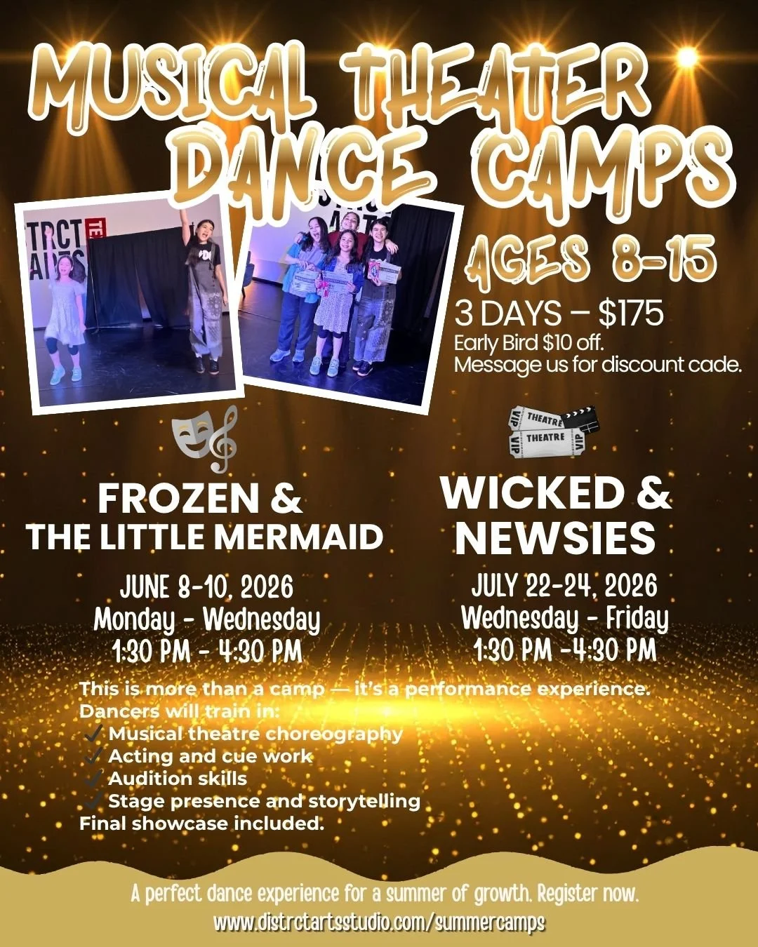 Dancers will train in musical theatre choreography, acting, and stage presence while developing confidence and performance quality. The camp concludes with a live showcase for parents.