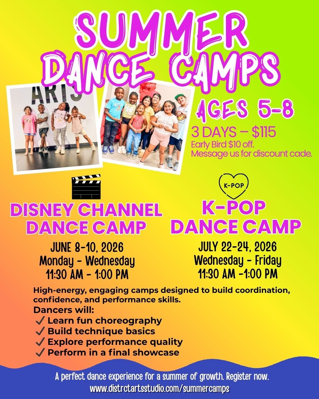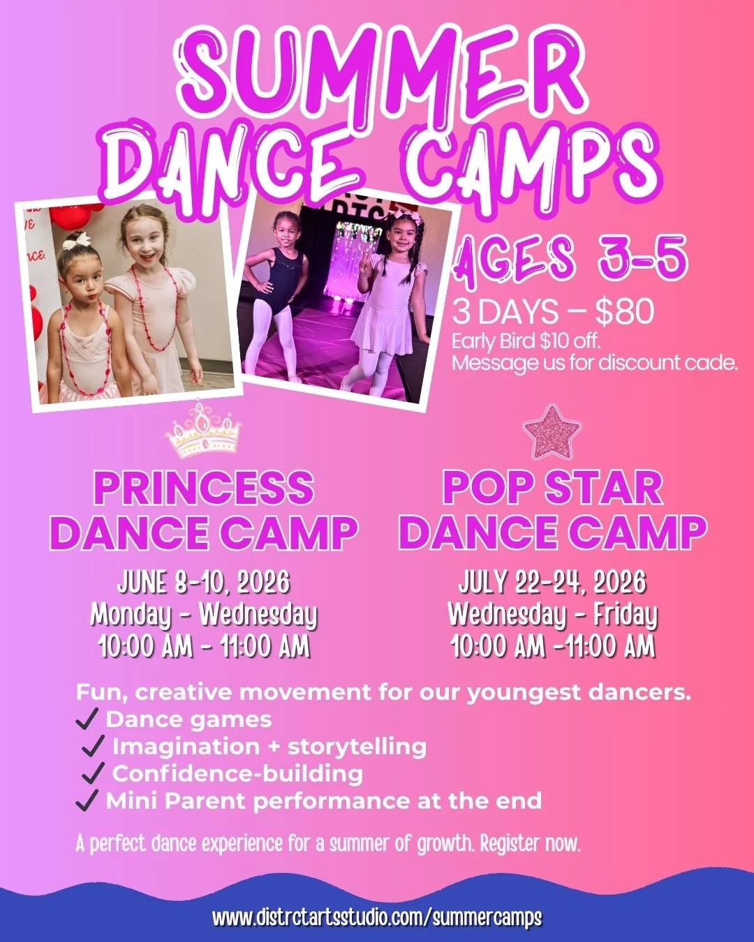 Register your dancer for June & July Camps and receive $20 off both camps. Message us for your discount code to use at checkout!